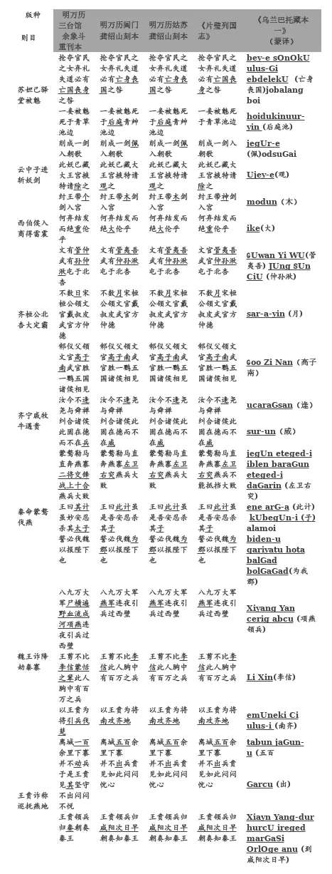 综合以上一系列穷尽式的参互比勘,我们最少可以得出两条结论。其一,十二卷本之明万历阊门龚绍山刻本和明万历姑苏龚绍山刻本虽然刊刻形制上有所区别,但二者内容完全一致。其二,蒙古国所藏《列国志传》梵夹装蒙古文译本译自十二卷本是毋庸置疑。至于译自明万历阊门龚绍山刻本还是明万历姑苏龚绍山刻本,无其他文献资料旁证的条件下,仅依靠译文内容,确难做出结论。再说,这样的考证,也没有任何实际意义。