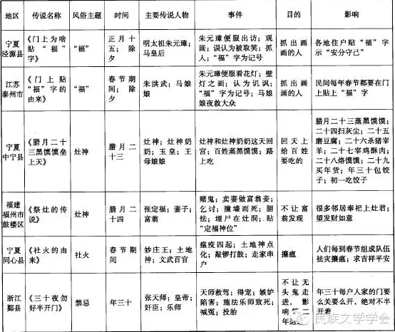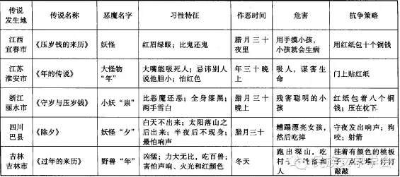 在《中国民间故事集成》中,另有不少关于“年”的传说。江西、江苏、浙江、四川、吉林、陕西、福建、宁夏等省均有此类传说。这类传说对春节的由来及其风俗具有较强的解释性,为了便于分析,笔者特制作以下表格[1]故事梗概便一目了然。